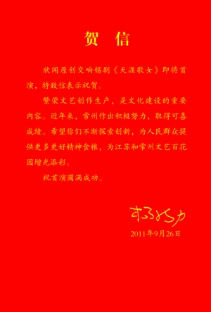 省委常委、宣传部长杨新力的贺信 市委书记范燕青的题词 代市长姚晓东的题词 着名京剧表演艺术家尚长荣的题词 由市委宣传部、常州日报社、市文广新局与北京好风好雨文化艺术有限公司联合出品的原创交响锡剧《天涯歌女》,经过1年多的精心筹备,昨晚在常州大剧院华丽公演。 出席观看首场演出的领导和嘉宾有全国政协港澳台侨局局长吕虹,北京市文化局党组成员、北京京剧院院长、北京演艺集团总经理李恩杰,全国政协外事办综合处处长汪岳波及省委宣传部、省文化厅领导等。 市委副书记、代市长、本剧总顾问姚晓东,市委常委、宣传部长、本剧总策划、总出品人徐缨,市人大常委会副主任赵忠和,副市长、市公安局长尚建荣,市政协副主席朱剑伟和市政府秘书长徐新民等也观看了演出。 出席首演式的还有该剧总策划、总出品人,原中央芭蕾舞团副团长、中国歌剧舞剧院副院长、作曲家刘廷禹;总导演,中国杂技家协会主席、河北省文化厅副厅长边发吉;艺术顾问、表演指导,着名京剧表演艺术家刘秀荣;编剧,着名剧作家、学者苏叔阳。 着名锡剧表演艺术家吴雅童、梅兰珍、沈佩华、王兰英、倪同芳、小王彬彬,周璇亲属代表苏瑛、苏莉,以及主创团队的其他专家到场祝贺。 锡剧,又称常锡文戏,常州是锡剧的摇篮与故乡。而金嗓子周璇,则是常州这方热土孕育的文化名人。作为上个世纪最具影响力的歌影双栖明星,她的银幕形象与歌声至今仍在华人世界广为流传。本次投排交响锡剧《天涯歌女》的初衷是以乡音唱乡贤,在创新中寻求锡剧传承与发展的新路,期望实现一个巩固体制改革成果的创新项目,创作一部传承与振兴锡剧的突围之作,塑造一张宣传城市形象的文化名片。 作为一部常州历史上阵容最强、创新力度最大的舞台艺术作品,该剧排演过程中,得到全国政协副主席、中国文联主席孙家正,省委常委、宣传部长杨新力等关注,并为之题词。 交响锡剧《天涯歌女》,分为序、初耀沪江、天涯放歌、艺坛辉煌、劳燕分飞、港地思乡、尾声,共五场,以主角周璇与严华的爱情故事为主线,以个人轨迹折射社会变迁,是一部以地方剧种锡剧为核心,混搭魔术、杂技、现代舞、现场交响乐伴奏、合唱团伴唱等多种艺术形式于一体的综合舞台剧。 该剧首开地方戏曲省内公开选角先河。女主角周璇扮演者是常州锡剧“新三朵花”之一、市锡剧院青年花旦李舒娴;男主角严华扮演者是省锡剧院主要小生汤达;国家一级演员沈蕙兰、陈鹰分别饰演养母、美茵。 昨晚,大剧院1500张位置座无虚席。全剧长达2小时的演出中,观众不时报以热烈掌声。当台词或场景中出现熟悉的常州地标和文化元素时,尤其第四场表现周璇离开流言杀人的上海滩回到家乡常州的过程,多媒体大屏上出现大运河、御码头、舣舟亭、文笔塔、篦箕巷、青果巷等场景时,许多观众觉得非常亲切。 |
